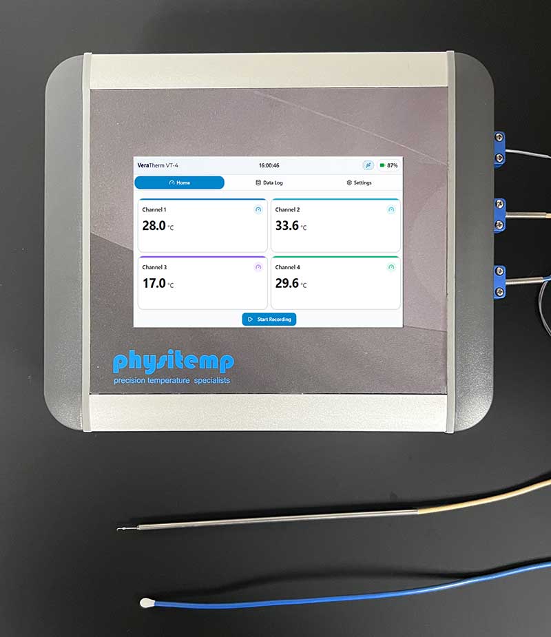 Introducing the VeraTherm VT-4, the new generation of precision thermometers from Physitemp, the trusted name in accurate temperature measurement for over 55 years. This modern, professional-grade instrument is engineered for accurate laboratory, research, and industrial applications. It combines a rugged, precision-milled aluminum chassis with an intuitive 5-inch touch interface and advanced data-logging capabilities. With its ability to monitor four channels simultaneously, the VT-4 provides the accuracy and fast response times often needed for critical temperature measurements.